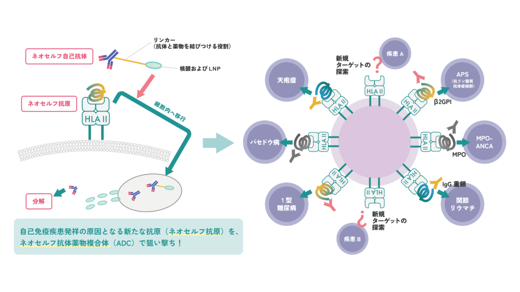 この課題の改善策として、本研究開発では、当社の共同研究パートナーである大阪大学の荒瀬尚教授が提唱した「ネオセルフ理論(※)」を基に、自己免疫疾患の新たな原因となる「ネオセルフ抗原」を探索し、特定の罹患臓器にのみ高い特異性を持つ次世代型の「抗体薬物複合体(ADC:Antibody-Drug Conjugate)」の開発を目指します。これにより、既存薬の大きな課題であった副作用を大幅に軽減し、あらゆる自己免疫疾患の根本的治療の実現を目標としています。